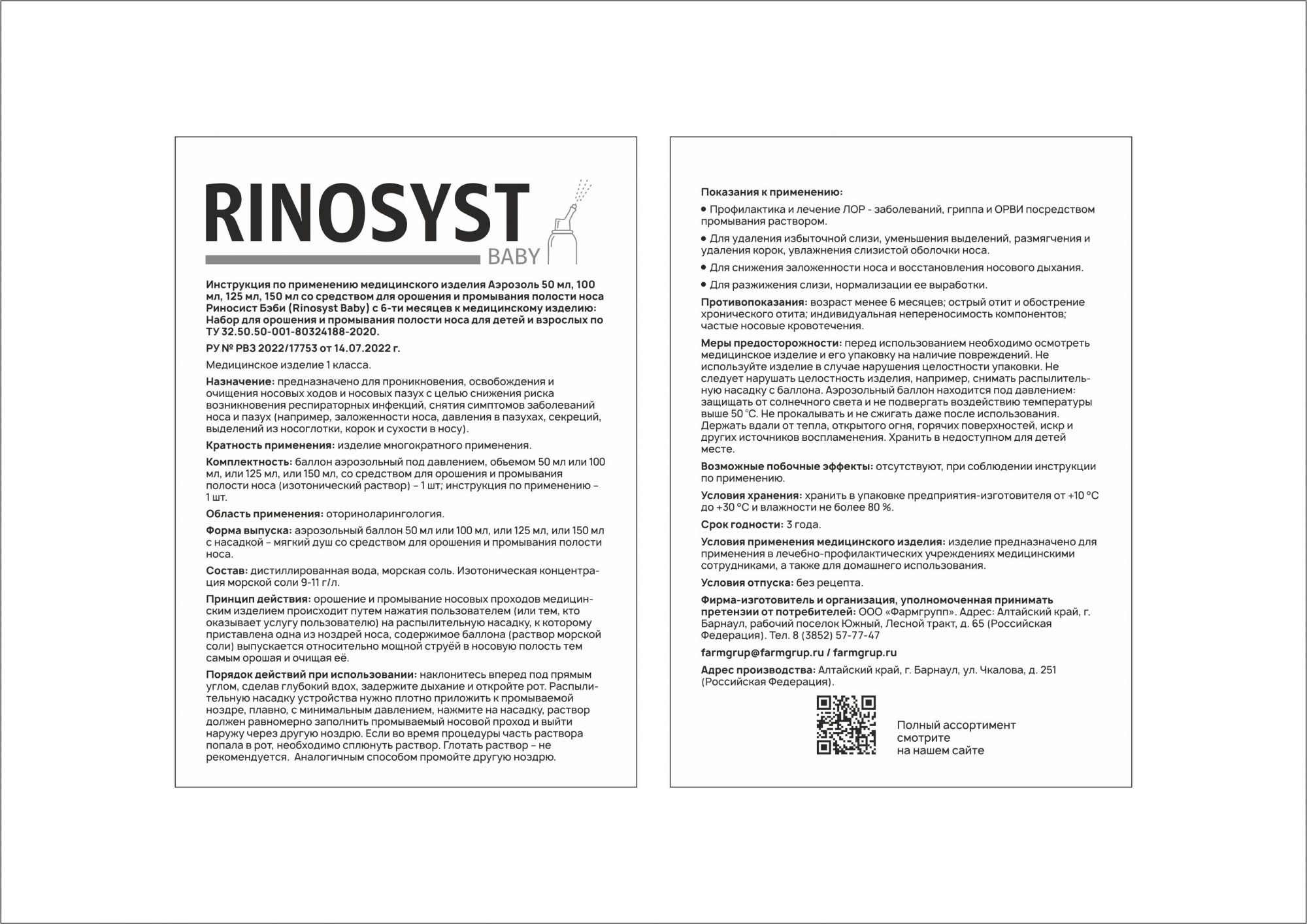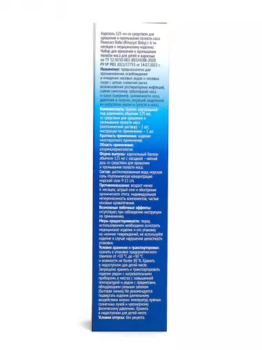 Аэрозоль 125 мл со средством для орошения и промывания полости носа Риносист Бэби (Rinosyst Baby) с 6-ти месяцев к медицинскому изделию: Набор для орошения и промывания полости носа для детей и взрослых по ТУ 32.50.50-001-80324188-2020.