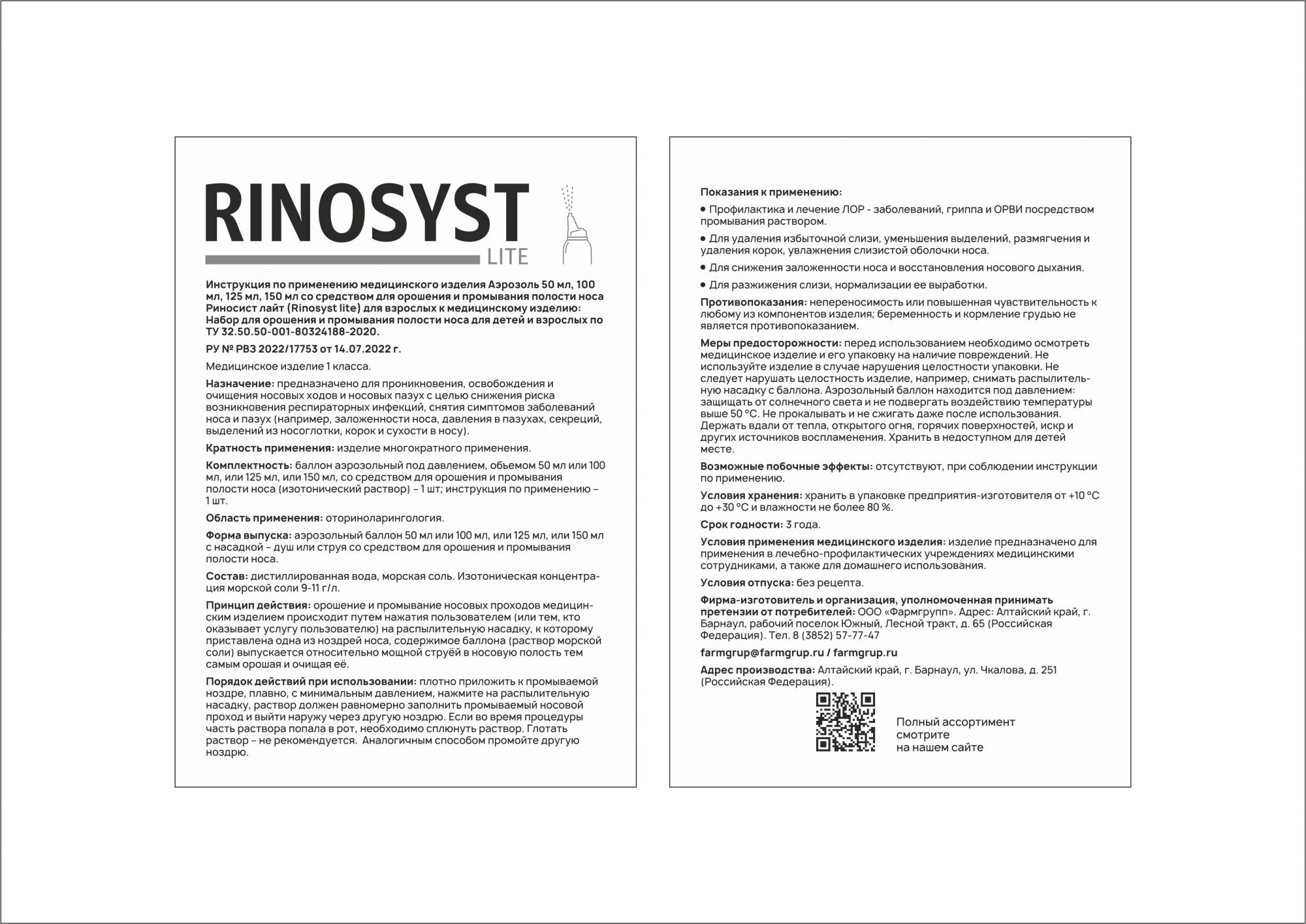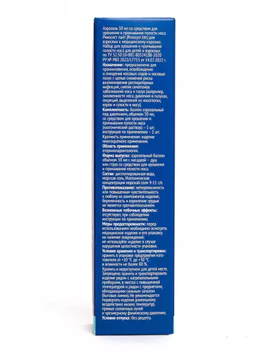 Аэрозоль 50 мл со средством для орошения и промывания полости носа Риносист Лайт (Rinosyst lite) для взрослых к медицинскому изделию: Набор для орошения и промывания полости носа для детей и взрослых по ТУ 32.50.50-001-80324188-2020