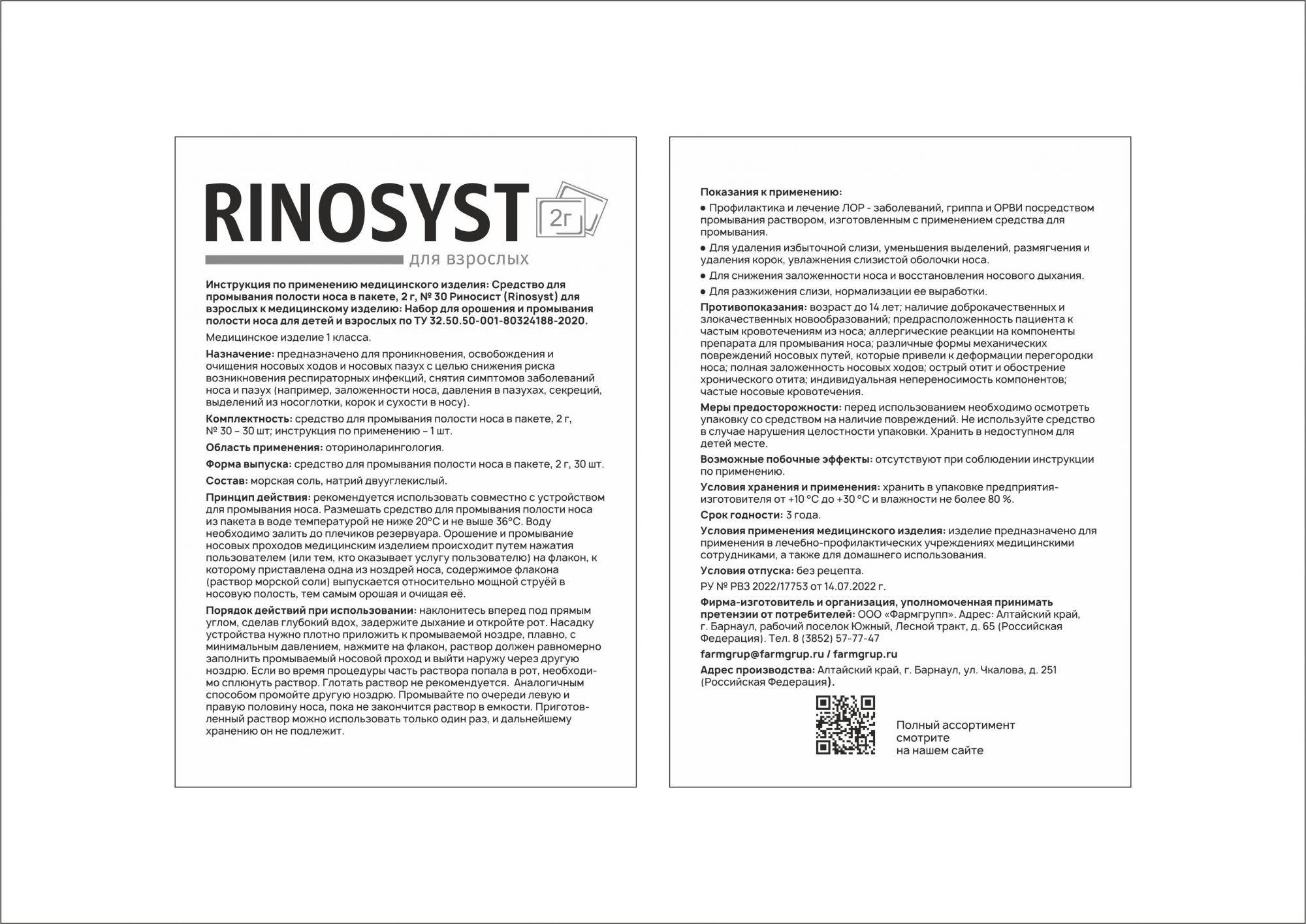 Средство для промывания полости носа в пакете, 2 г, № 30 Риносист (Rinosyst) для взрослых к медицинскому изделию: Набор для орошения и промывания полости носа для детей и взрослых по ТУ 32.50.50-001-80324188-2020